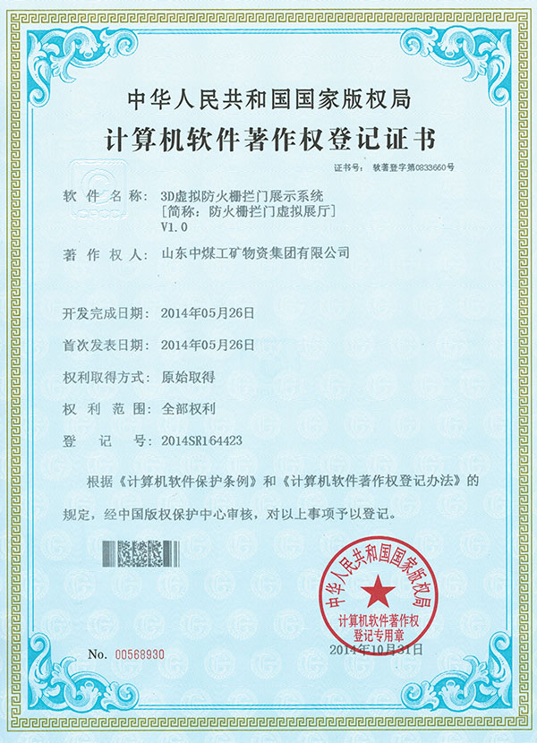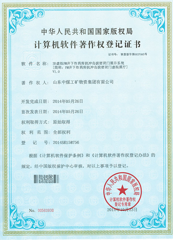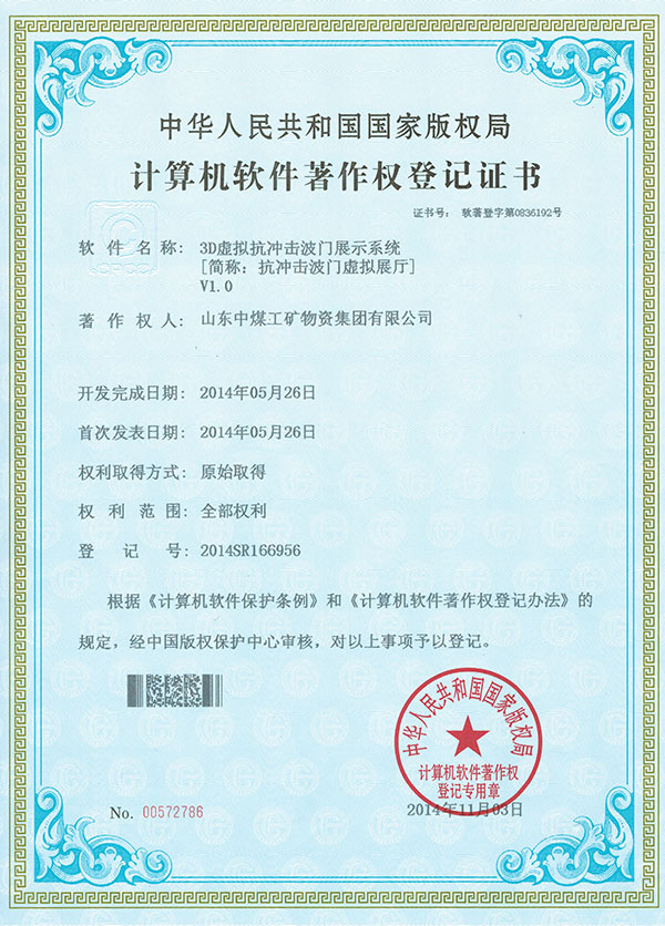 近日,由山东中煤工矿集团自主研发的五项软件再次获得中华人民共和国国家版权局计算机软件著作权登记证书。 它们分别为:“3D虚拟U型钢支架展示系统【简称U型钢支架虚拟展厅】V1.0”、“3D虚拟抗冲击波密闭门展示系统【简称抗冲击波密闭门虚拟展厅】 V1.0”、“3D虚拟抗冲击波门展示系统【简称抗冲击波门虚拟展厅】V1.0”、“3D虚拟防火栅栏门展示系统【简称防火栅栏门虚拟展厅】V1.0”、 “3D虚拟FM井下炸药库抗冲击波密闭门展示系统【FM井下炸药库抗冲击波密闭门虚拟展厅】V1.0。