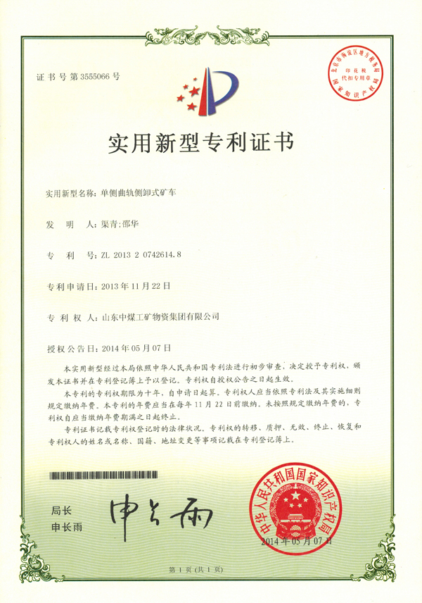 近日,经国家知识产权局审核批准,山东中煤工矿集团——单侧曲轨侧卸式矿车荣获实用新型专利证书。